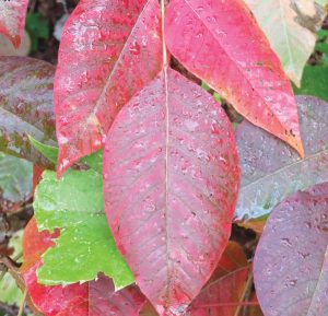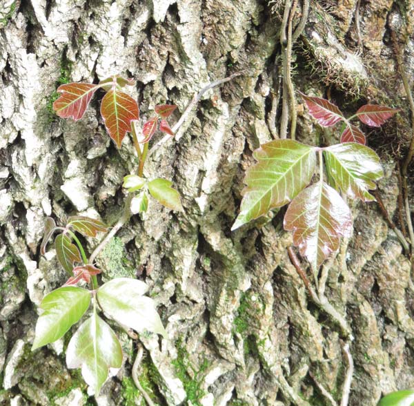 Poison ivy can take on many habits. It is usually a hairy vine that climbs up trees or anything vertical – up to 100 feet – but it can also grow as a ground cover up to 2 feet tall or as a bushy shrub up to 4 feet tall. The Latin name is Toxicodendron radicans (also listed as Rhus radicans). Of course, it is well-known for producing an annoying, itchy rash that is caused by urushiol (you-roo-shee-ol), which is a clear liquid compound in the sap of the plant. Its purpose is said to help the plant retain water.