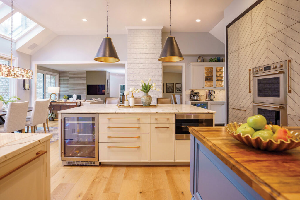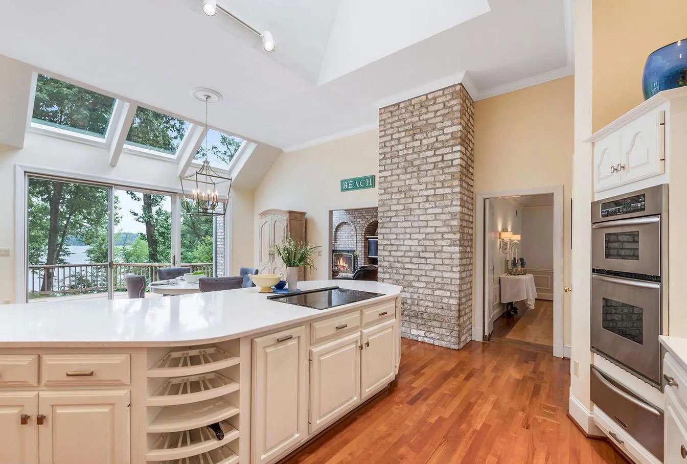 In an era when buzzwords such as casual, comfortable and cozy define home design, this house definitely reflected a bygone time period. The formality of the house had to be dialed down a notch! That would be solved by creating an open-concept plan on the first floor. As it stood, each of the rooms was an entity unto itself. One unfortunate point was the fact that the enclosed dining room didn’t offer a view of the river. The kitchen layout was awkward and the cabinetry was outdated. Brick-lined accent walls clashed with the hardwood and marble floors.