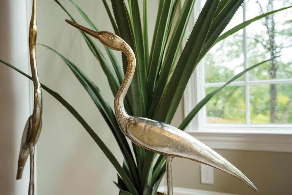 Metallic shorebirds add a subtle coastal element to the room’s décor.