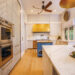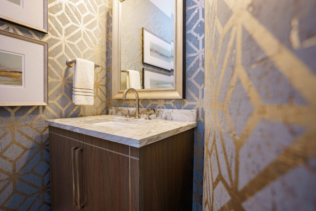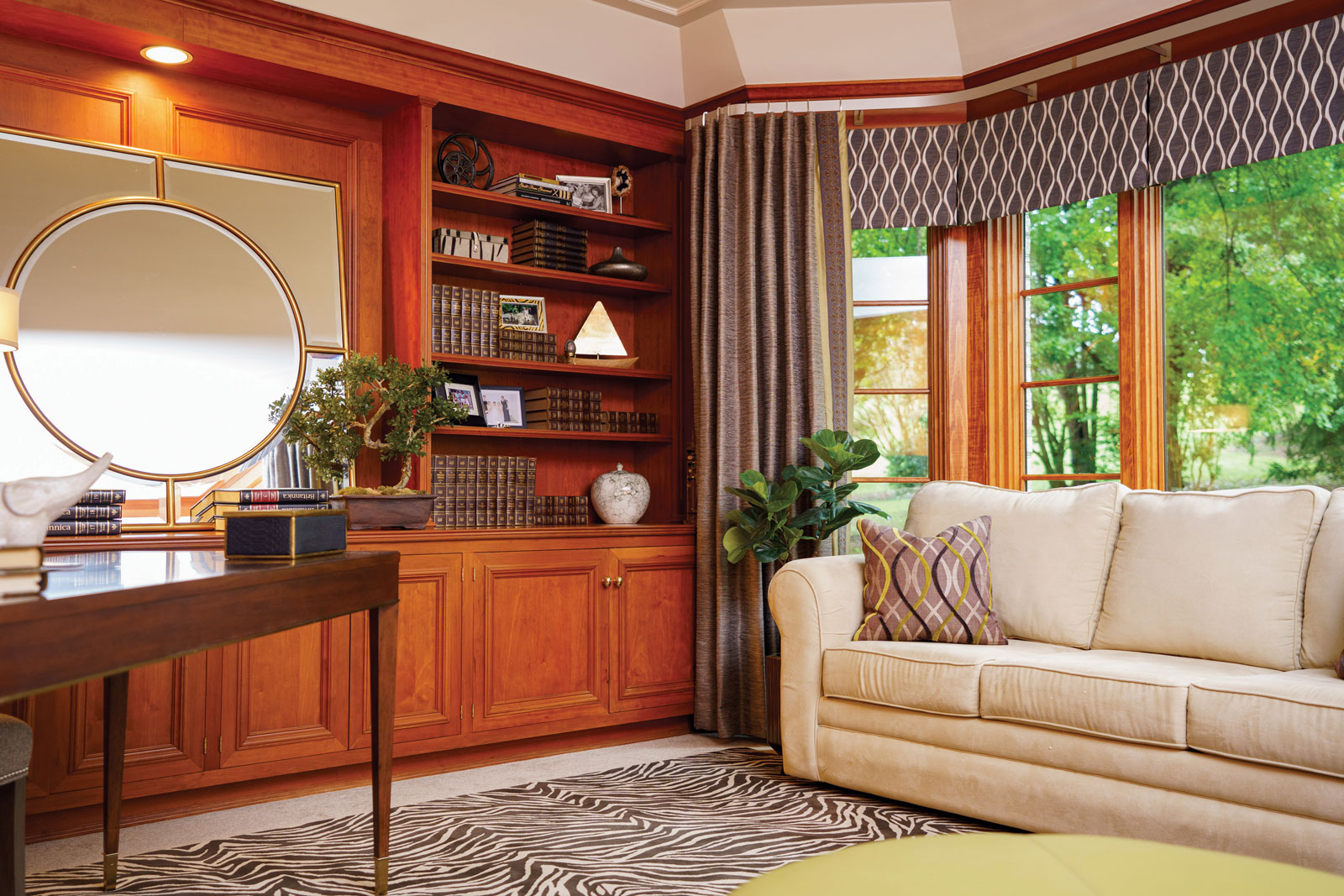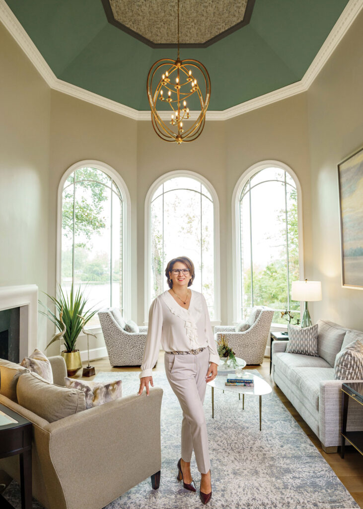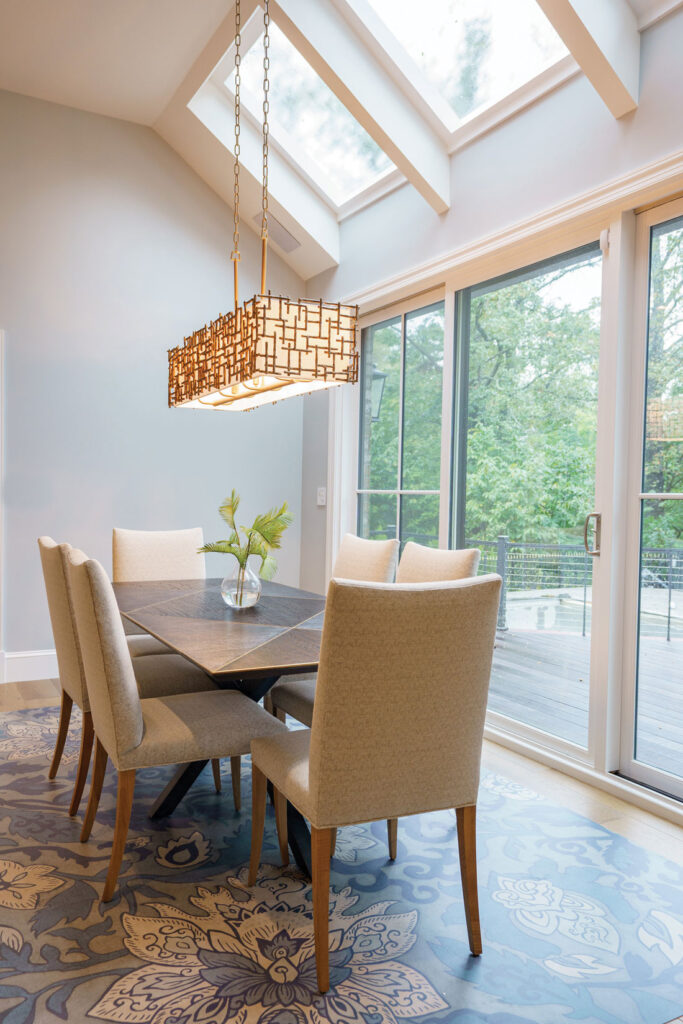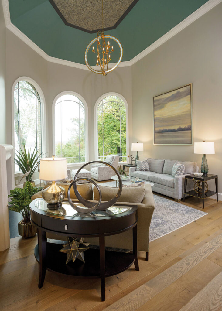 The concept of the sunken living room – aka the conversation pit in ’60s lingo – is staging a comeback. Now being referred to as Zen zones or lounges, they provide the perfect separation from the togetherness that open-concept floor plans foster. Here, the two steps that span the width of the room’s entry point, replaced the two railings and narrow steps that separated it from the other areas. A sophisticated coastal-inspired color palette and transitional furnishings make it the perfect room for relaxing or socializing. The new windows frame the views of the sky, water and trees. Kathy brought added interest to the decorative ceiling with paint and wallpaper.