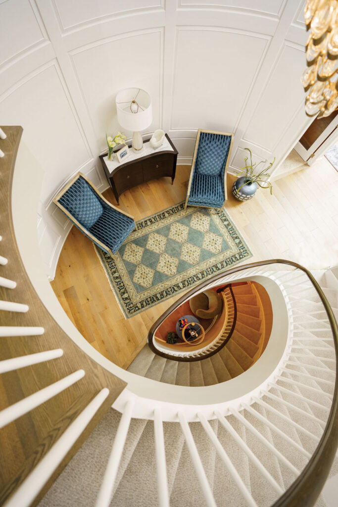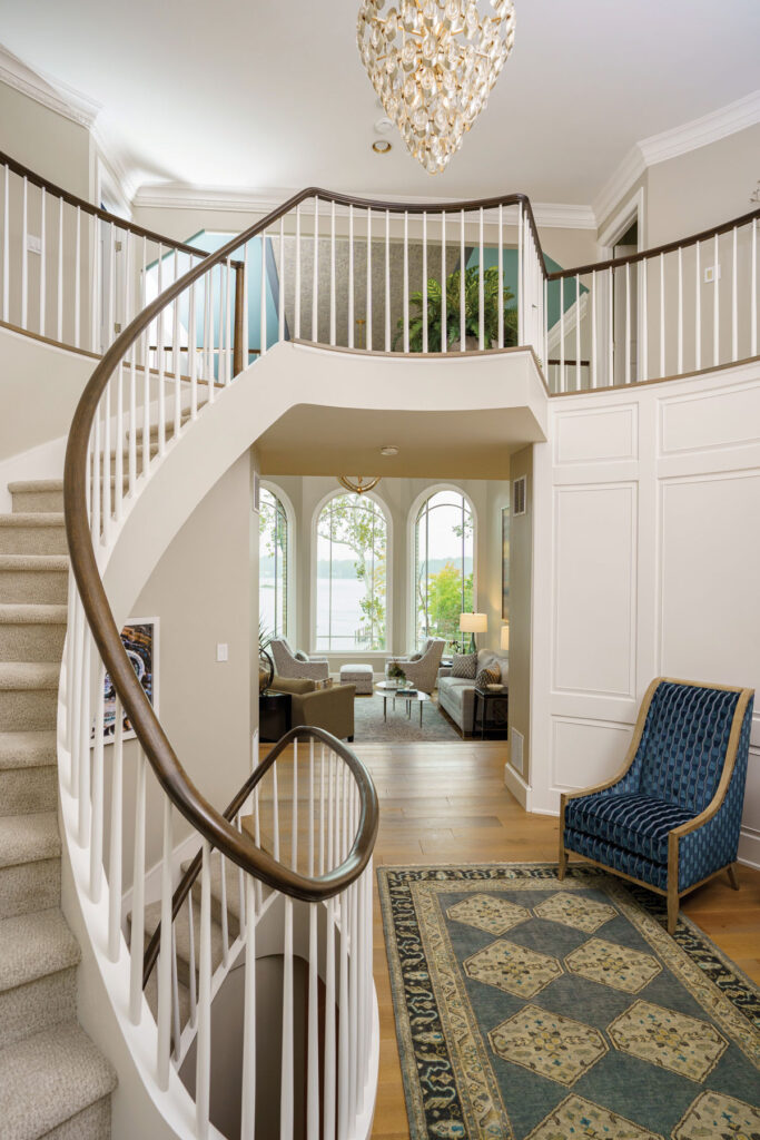 Regarding the office, those too have become important additions to getaway homes, due in part to telecommuting. “We decided to keep it as an office so that guests have a private place for phone calls or to get work done,” the wife elaborates. Glass entry doors ensure complete privacy. The spectacular staircase winds its way from the lower level to the second floor.