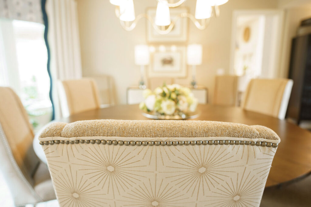 The dining room chairs exemplify the yin and yang of modern-day entertaining. The silk-like starburst fabric on the back of the chairs exudes formality, while the forgiving performance fabric on the front/seating of the chairs addresses casual, carefree comfort.