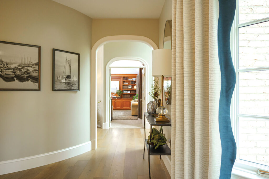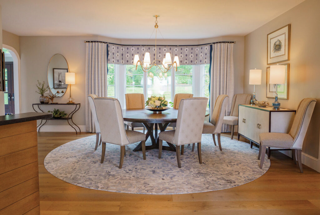 Subtle coastal influences in the dining room include wavelike blue edging on the draperies and vintage black-and-white photos from Annapolis that hang on the curved wall.