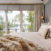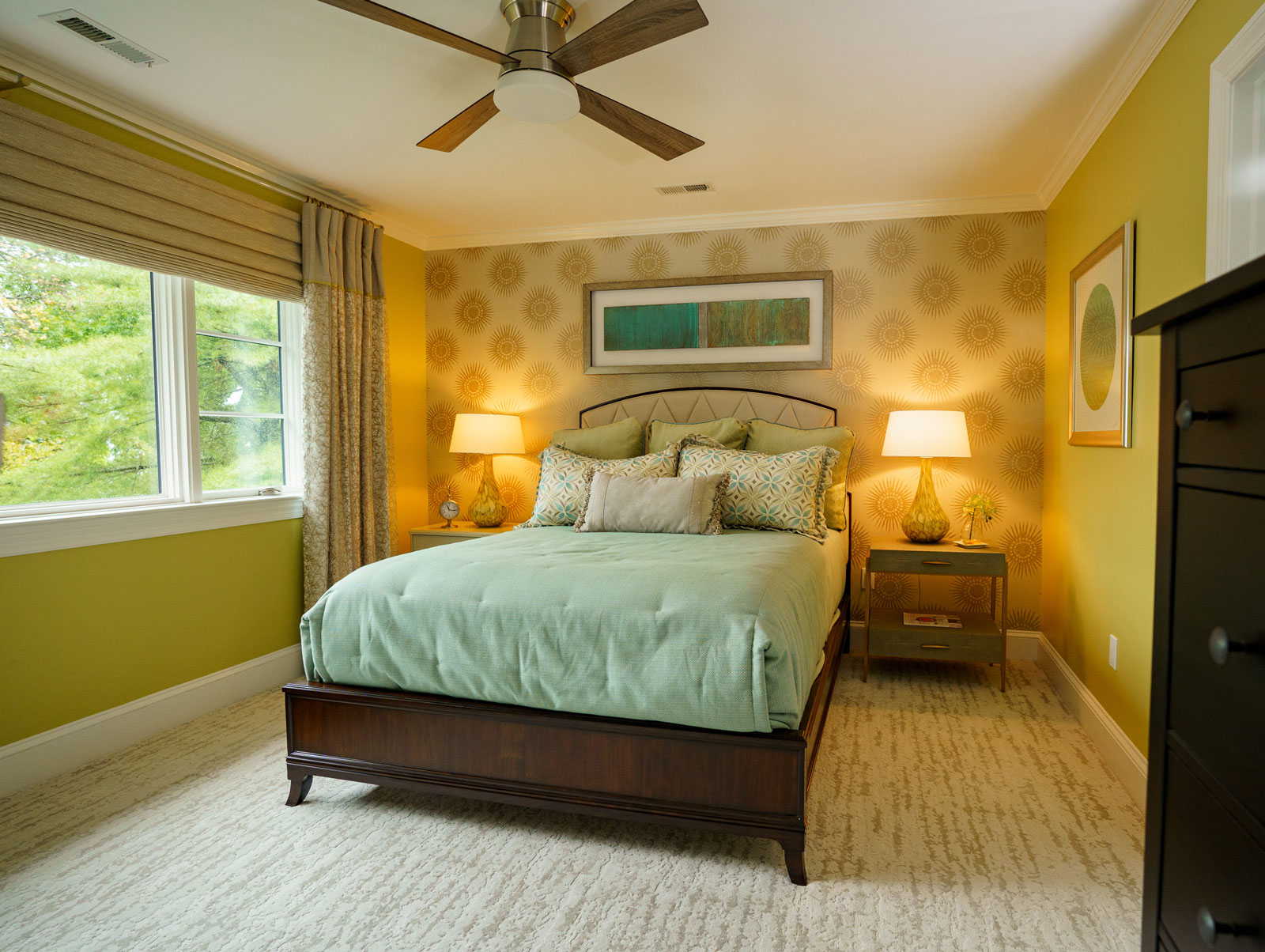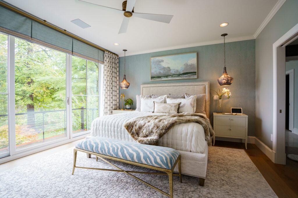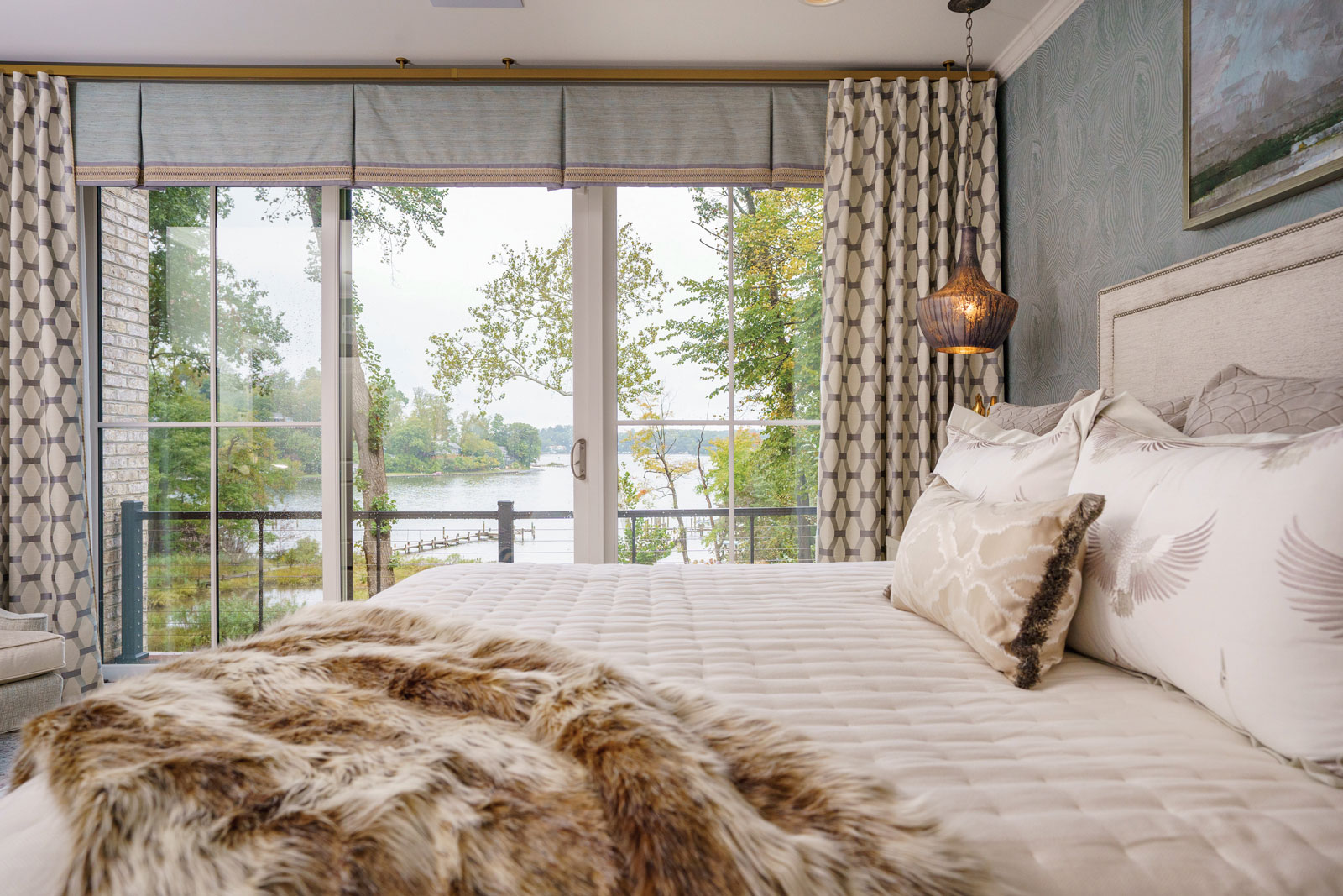 In the case of the living areas at the Annapolis house, transitional styling solves the dilemma. The primary suite, however, is 100% hotel-chic, as it features luxe bedding, exotic lighting, a spa-like bath, a glam walk-in closet and, of course, a view that is well worth waking up to. Even the bathtub is situated so that one can relax (with a glass of wine!) and get lost in the view.