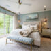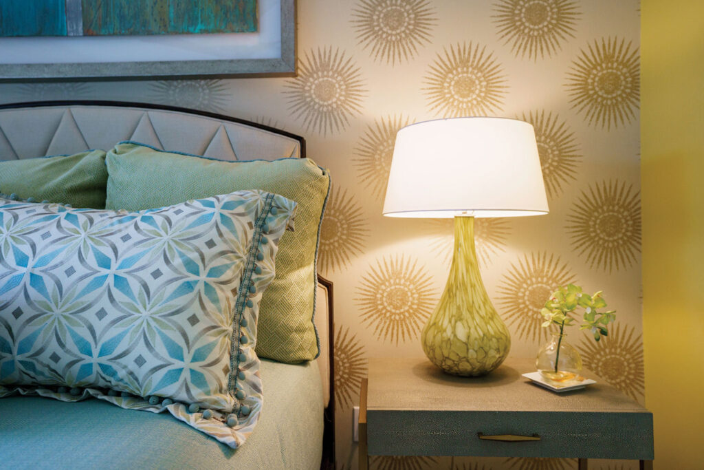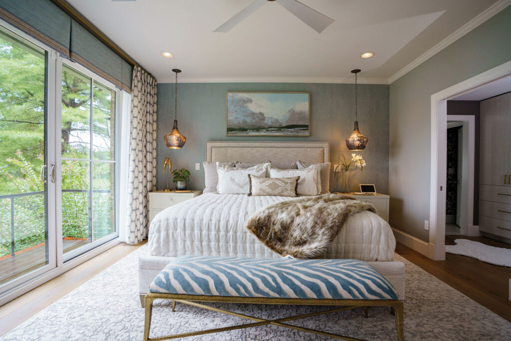 Hotel-chic was the game-plan for the primary suite. Luxe fabrics, Moroccan-inspired lighting, touches of gold and a view worth waking up to make it the ultimate getaway. There’s also a touch of coastal courtesy of the blue-and-white animal-print fabric that covers the bench at the foot of the bed.