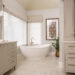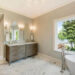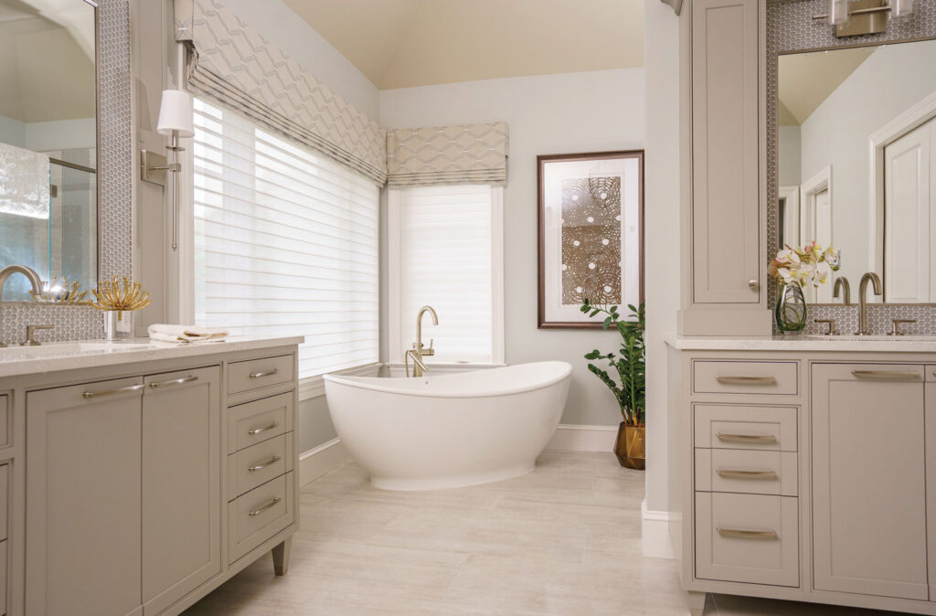 The serene color palette in the bath makes for the perfect way to begin or end a day. Features include his-and-her vanities, a spa-like shower, a tub with a view, penny-round tiled walls and Silhouette shades from Hunter Douglas.