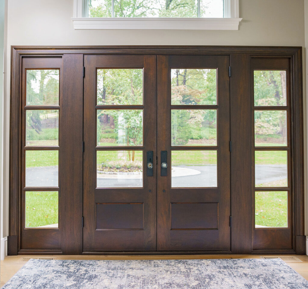 In the case of the solid-wood entry doors, custom glass-and-wood doors replaced them. “I wanted people to be able to arrive and be greeted by the view of the river even before they step into the house,” the wife explains of the unobstructed view that now exists.