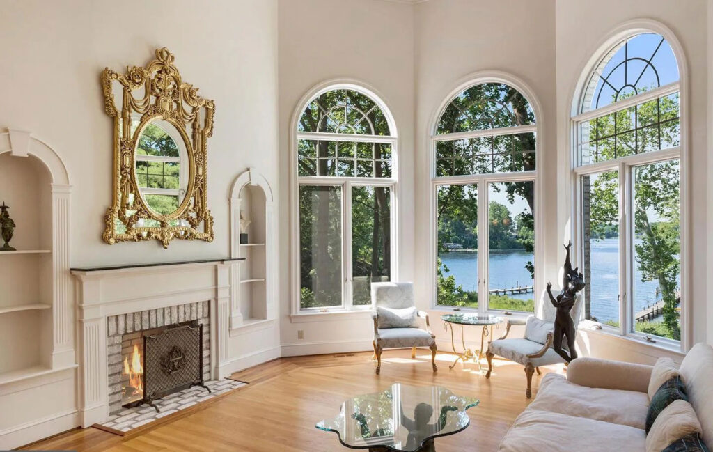 The redesigned kitchen is a cook’s dream – the wife loves to cook – and again, it lends itself to entertaining 21st-century style, as it isn’t isolated from the other areas. It’s adjoined by a light-filled, glass-enclosed breakfast room that overlooks the back of the property and the river beyond. A cozy sitting area (with a fireplace) is also part of the open configuration.