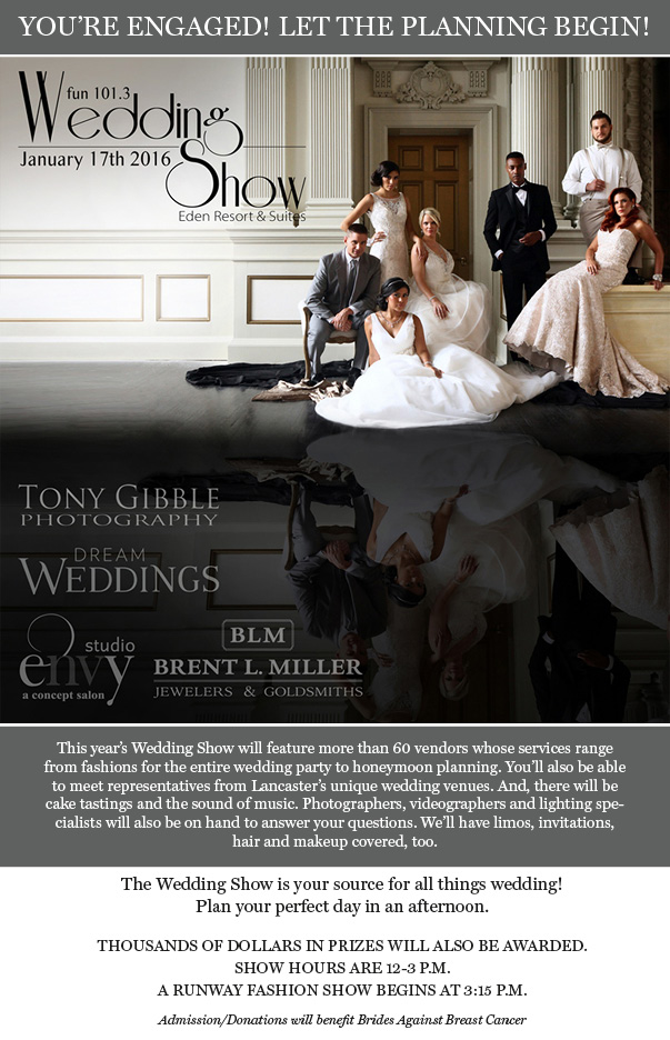 We invite you to begin your journey at this year’s fun 101.3 Wedding Show. The ballrooms at the Eden Resort & Suites will be filled with vendors who can bring your vision – and dreams – to life. The show will provide you with the perfect opportunity to meet Lancaster’s finest vendors, sample food (cake!), gather ideas, glean information and win exciting prizes.