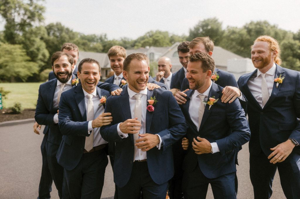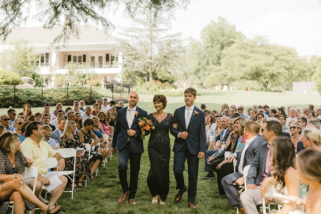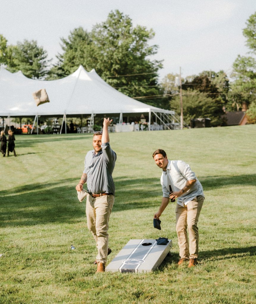 “We wanted it to be a wonderful wedding,” Tracy explains. “We wanted everyone to feel the love, live in the moment and enjoy our home here in Lancaster.” Megan and Tommy, who wanted their wedding to feel “warm, vibrant and joyful,” made their intentions clear in the invitations and on their website: the dress code was wear what makes you comfortable, hence guests wore everything from black tie and cocktail dresses to shorts and sundresses. That sentiment applied to Tommy and his groomsmen: they went from wearing tuxedos to more casual blue suits.