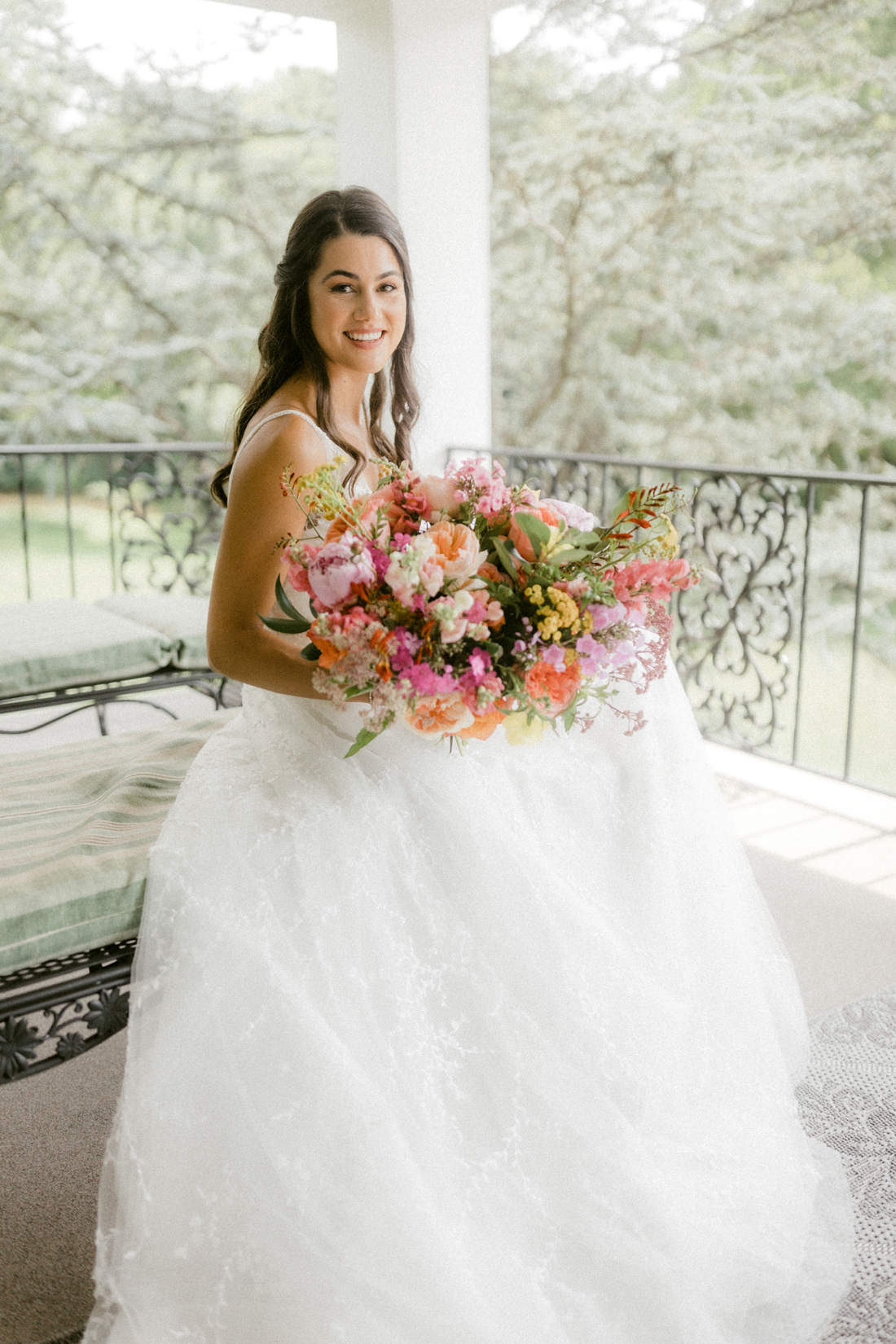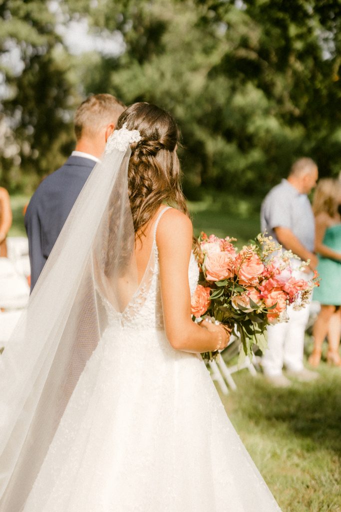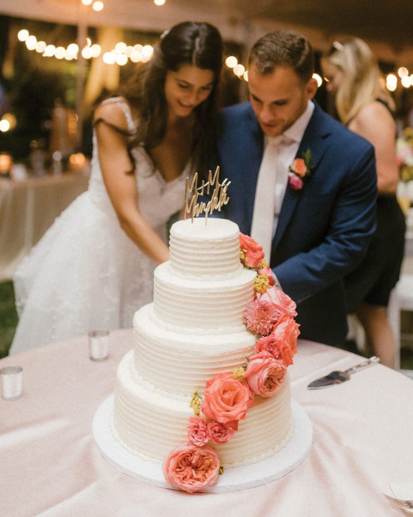 Petals With Style helped Megan make the transition from a white color scheme to one that featured summery tones via florals (and table linens) that, in Megan’s estimation, “beautifully complemented the deep greens of summer.” That was especially evident with the wall of flowers that brought a pop of color to the island, where the ceremony was conducted.
