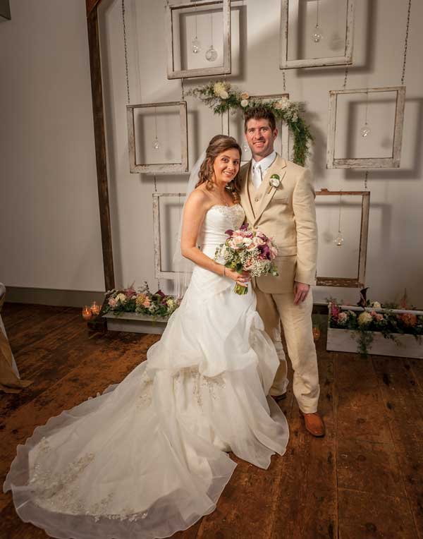 Vision/Theme: Briana loves antiques and vintage items and sometimes thinks she was born in the wrong era. “As soon as I toured the Union Meeting House, I knew it was the site where I wanted our wedding to take place,” she says. “It perfectly meshed with the romantic and intimate ambiance I wanted to create.” From there she went to work in order to add personal touches to the historic building that dates to 1818. For example, her sister borrowed an old typewriter from a family member, while Briana scoured Pinterest for other ideas. The décor was fashioned from burlap, lace, tulle, white twinkle lights and organza. The couple exchanged vows in front of a backdrop that was crafted from old windows Justin found in his grandfather’s barn. The frame was embellished with lights and flowers.