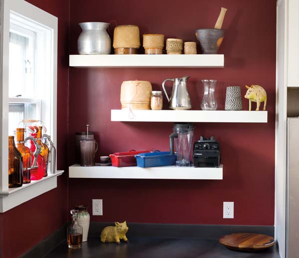 An L-shaped configuration of cabinets on the opposite wall multitasks by providing storage and a nook for the microwave, as well as ample counter space for prepping or displaying food. “People will come into the kitchen and hang out while I’m cooking, so it’s a great place to set up a bar and hors d’oeuvres,” he says. Appropriately, the walls are painted a hue that mimics red wine; a section was overpainted with black chalkboard paint, which allows Rafe to display the evening’s menu for his guests.