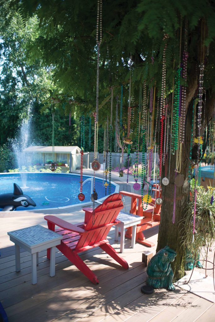 Dennis periodically travels to New Orleans to visit former neighbors Dave and Sarah Holt. Seeing all the beads hanging in trees and on fences throughout the city inspired the idea to hang souvenir beads from Mardi Gras from a tree on his property. “I’ll take an empty suitcase along and bring the beads home in it,” he explains.