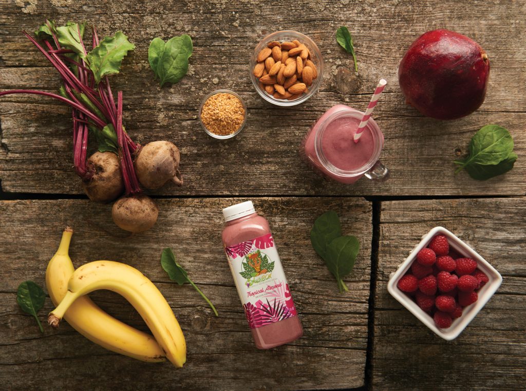 Tropical Almond, a thicker, creamier smoothie, is made with almonds (for added protein), berries and bananas. It’s great as a meal replacement on the go.