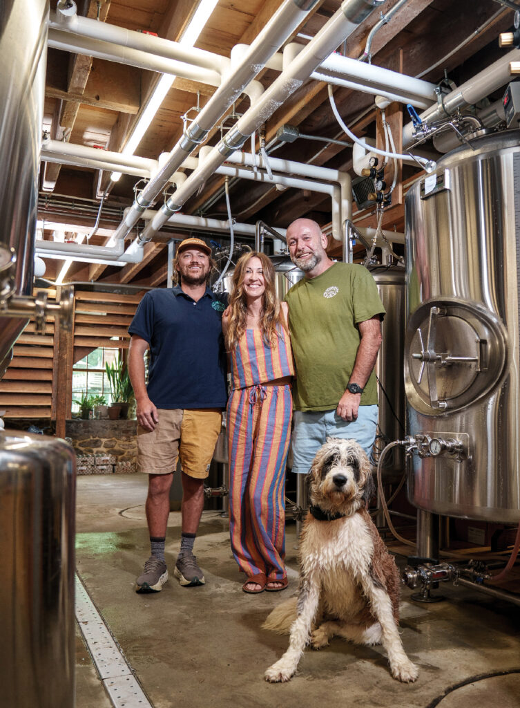 Zach, Dana and Joe are joined by water-loving Maggie, who may have a product named in her honor in the future. The four are pictured in the mill’s production area that will soon give way to a distilling operation.