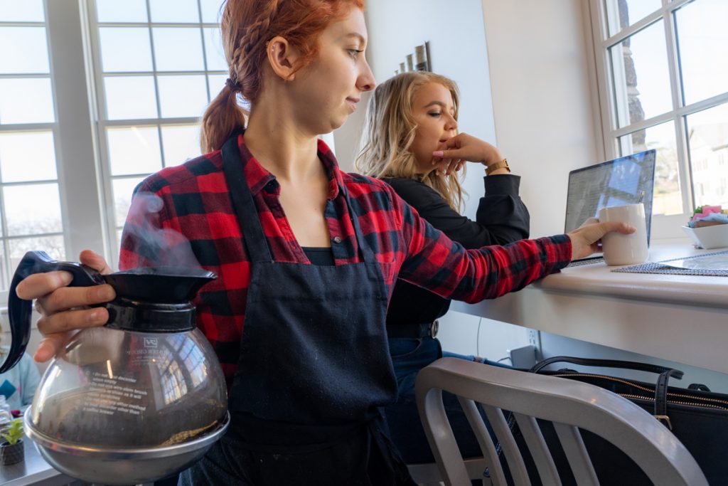The café has a light, airy feel thanks to high ceilings, a plethora of windows and walls that are painted a crisp white. A garage-type door can be rolled up in warm weather. Background music adds to the inviting atmosphere.