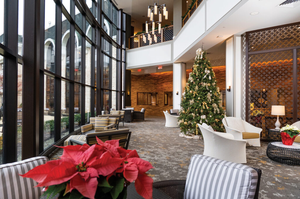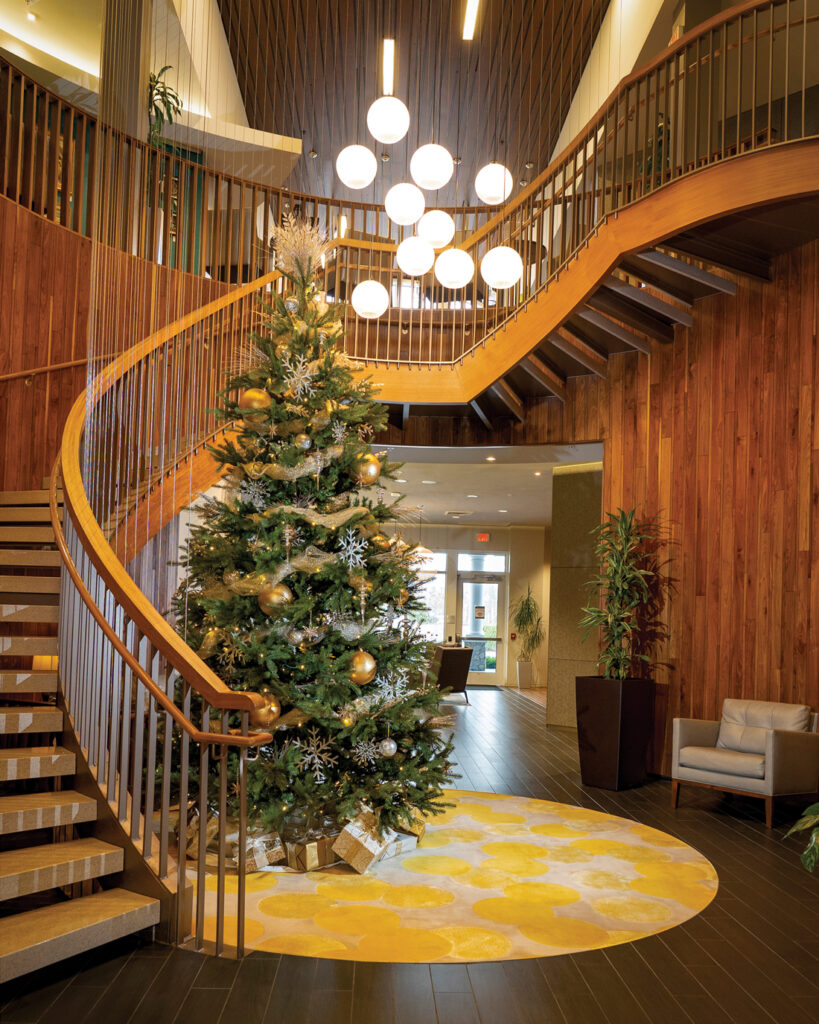 Dozens of towering trees decorate the buildings around the Willow Valley Communities campus, bringing holiday enjoyment to residents and their guests. Seen here is a tree in The Clubhouse.