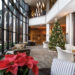Inside the glass-enclosed atrium, trees, poinsettias and other holiday decorations reflect the season.
