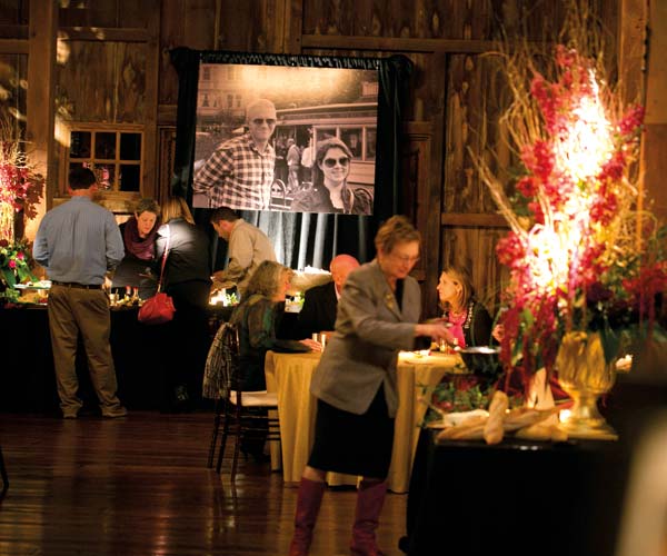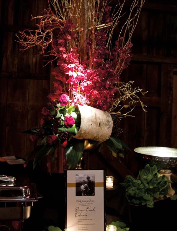 The expansive plank walls of the venue’s renovated barn were transformed into an art gallery for the party, documenting the couple’s travels with large photographs of Liz and Geoff enjoying their trips – biking, skiing and soaking up the glamour and good life of their favorite destinations.