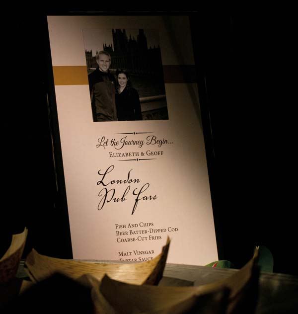 Food stations were themed by the various destinations of the couple’s travels, with menu items reflecting the specialties of their visited cities. San Francisco’s sourdough bread and a Chinatown-inspired Asian salad tempted the 90 guests, alongside classic London Pub fare of Fish and Chips, Colorado beef sirloin, and a lavish Las Vegas-style spread of sushi and California rolls. And remember that proposal made over peppermint ice cream? Liz’s favorite dessert made an encore with chocolate straw garnish and chocolate ganache squares.